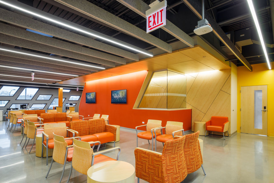 While blurring the lines between public plaza, lobby, and site, the colorful plaza attracts both the community and orients visitors to and through their ultimate destinations. This flowing and open lobby plan, located at the most predominant corner of the site, becomes the central and vibrant hub of the facility.